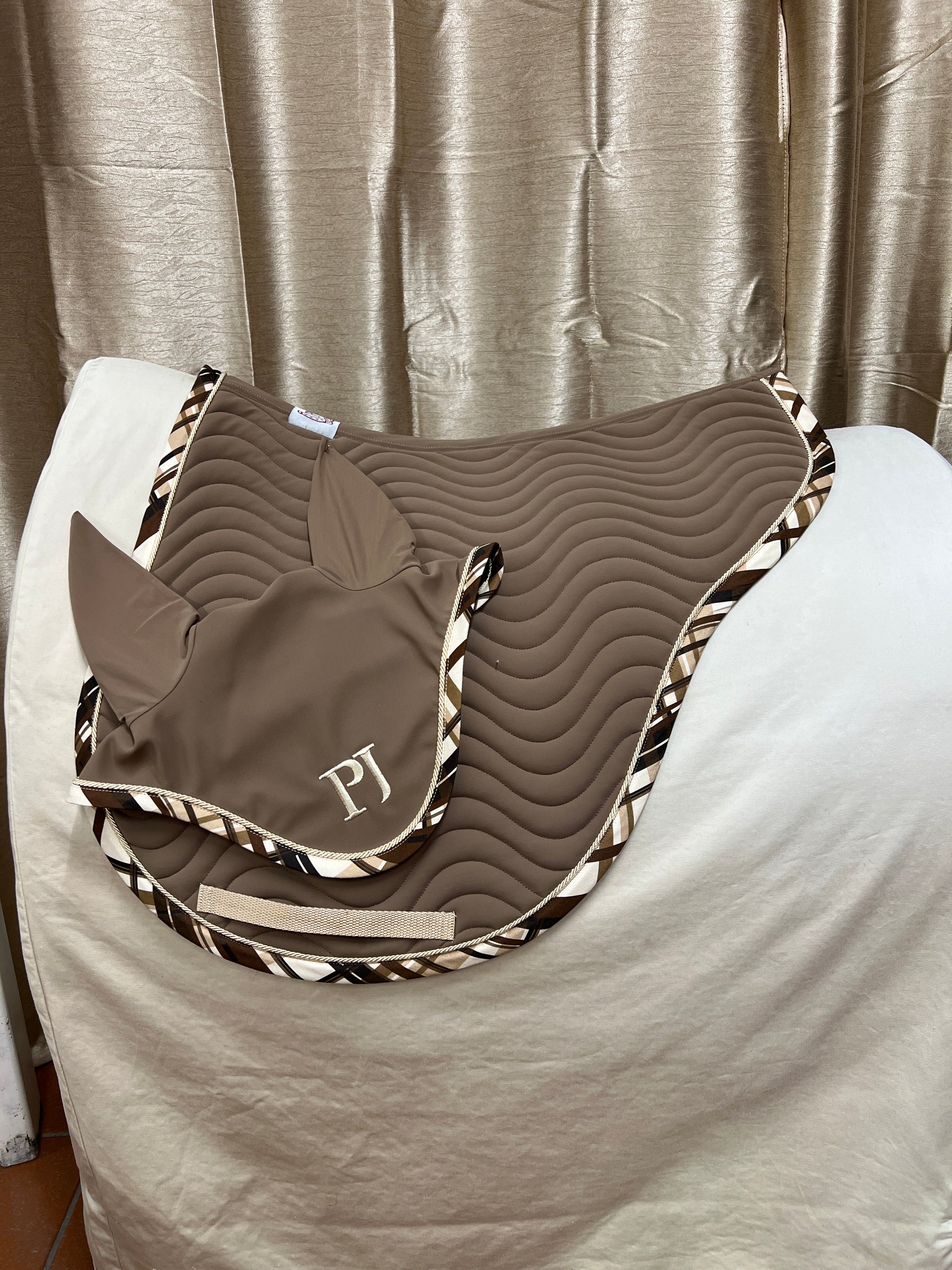 Sottosella sagomato in lycra con trama ondulata con bordo scozzese e cordoncino panna e cuffia abbuonata.